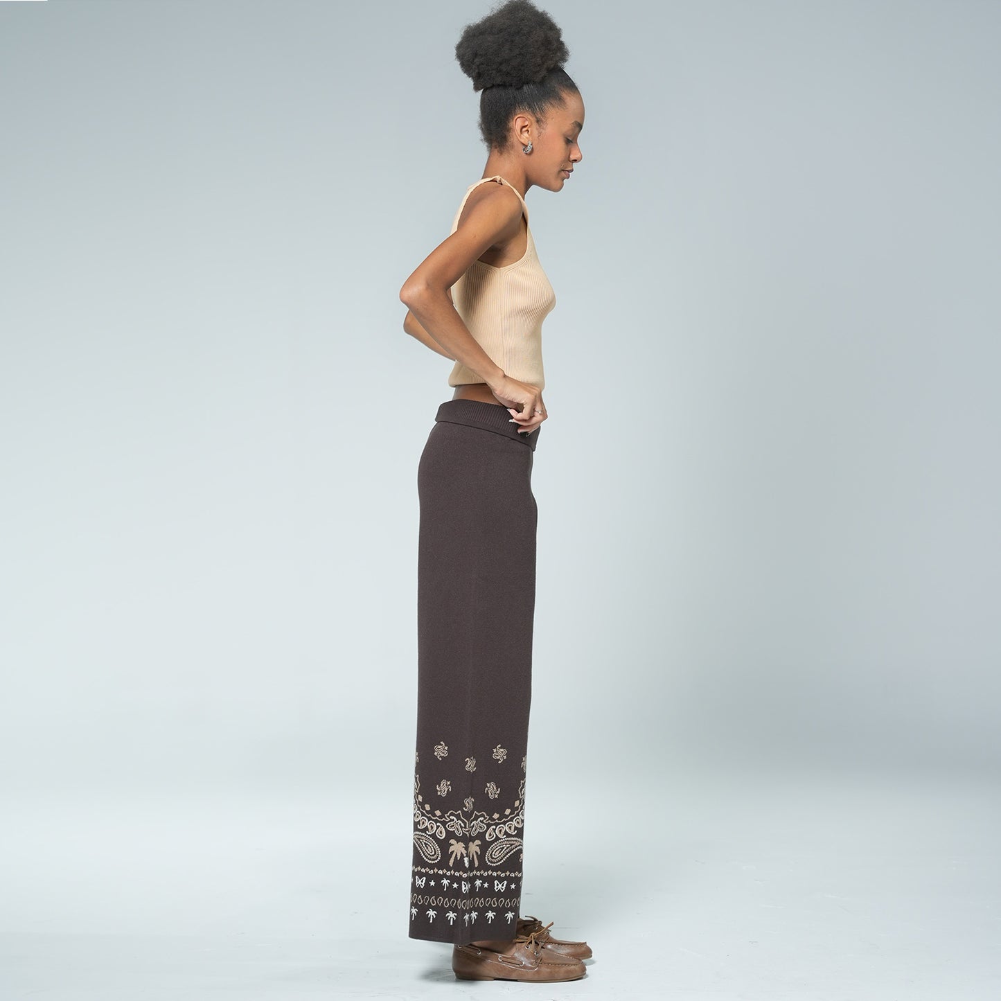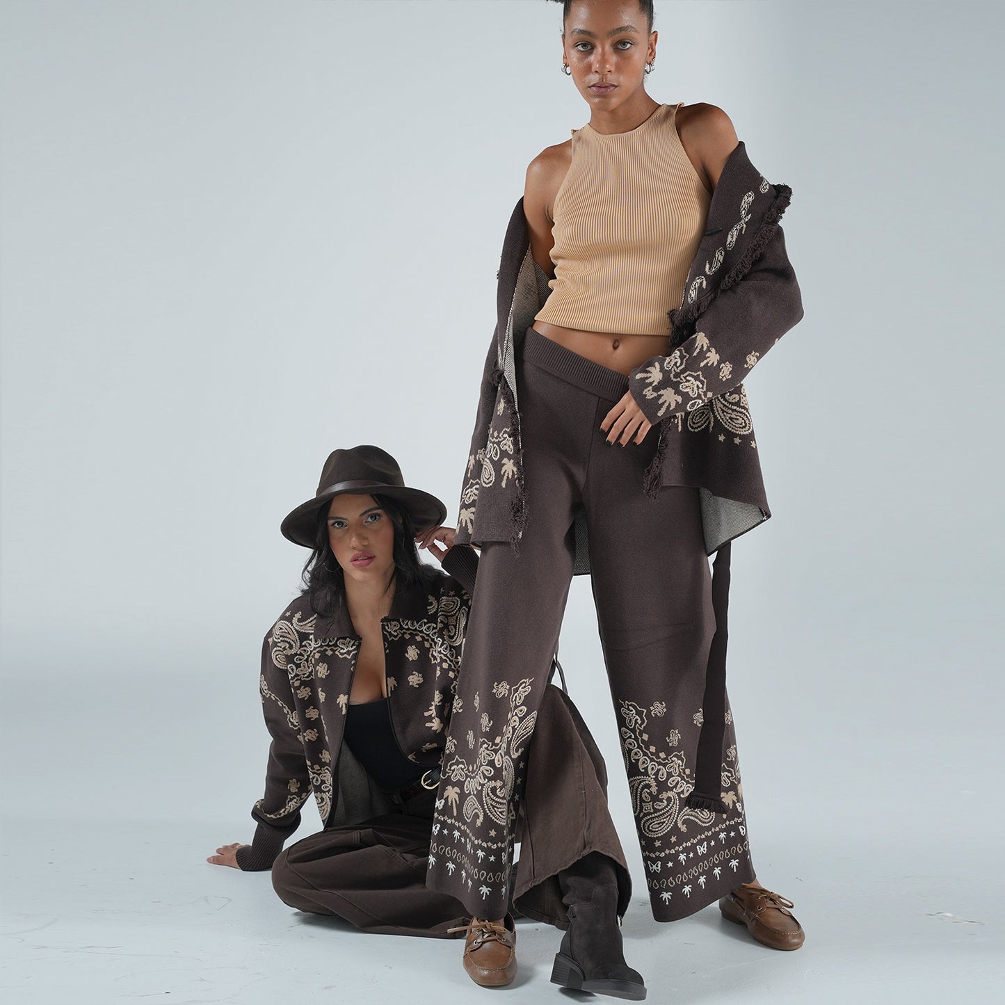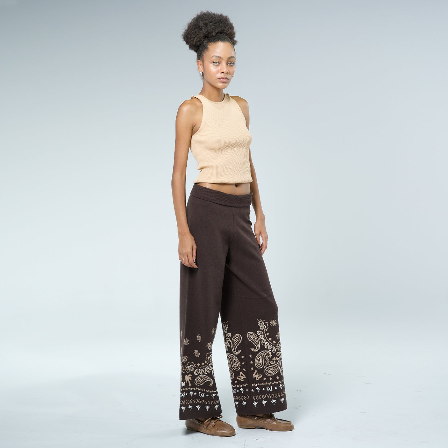 Caprica Jakarlı Geniş Paça Pantolon – Kahverengi & Bej