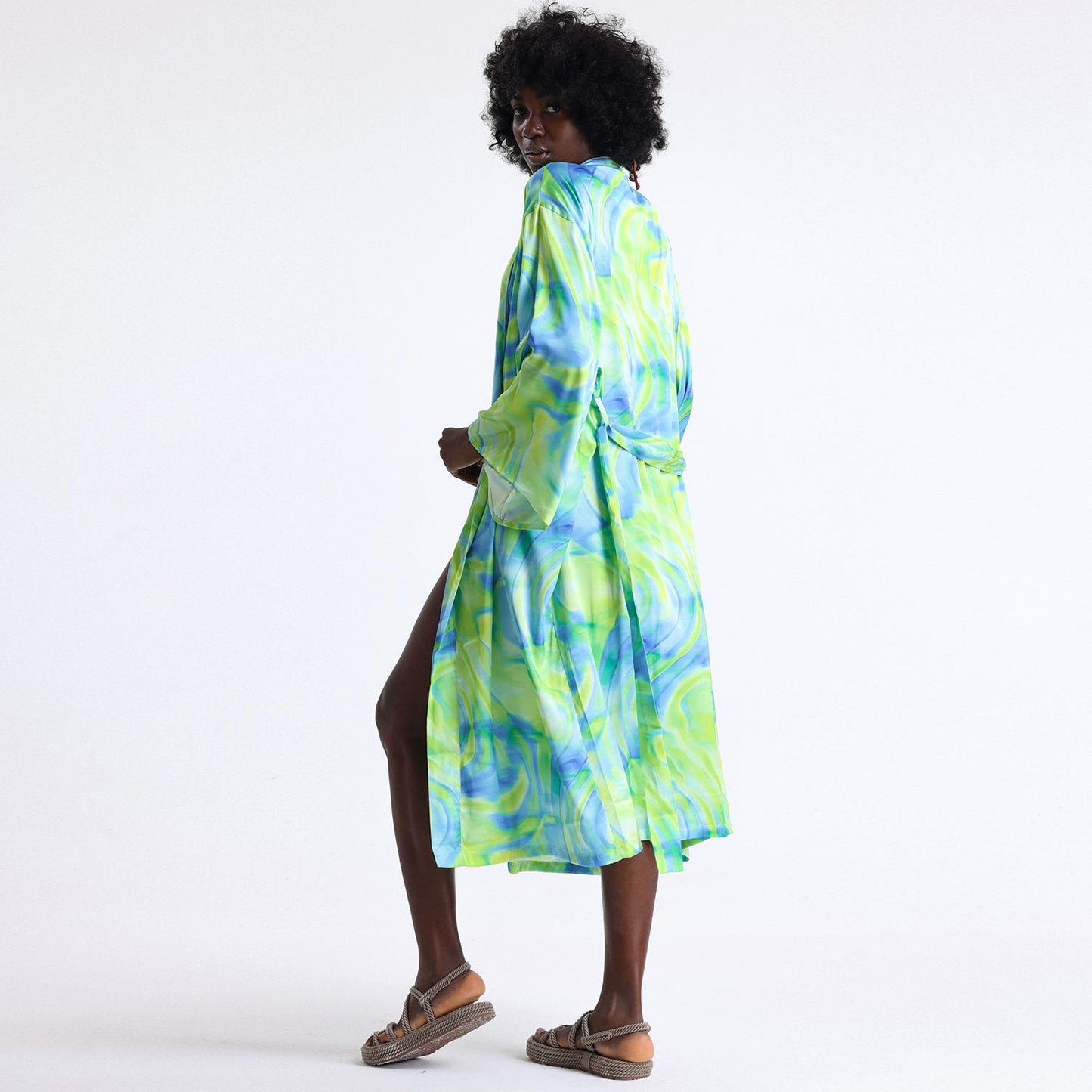 Büyüleyici yeşil ve okyanus mavisi kıvrımlara sahip havadar şifon kumaştan üretilen bu parça, siluetinizin üzerine zarif bir şekilde dökülerek hem konfor hem de stil sunuyor.