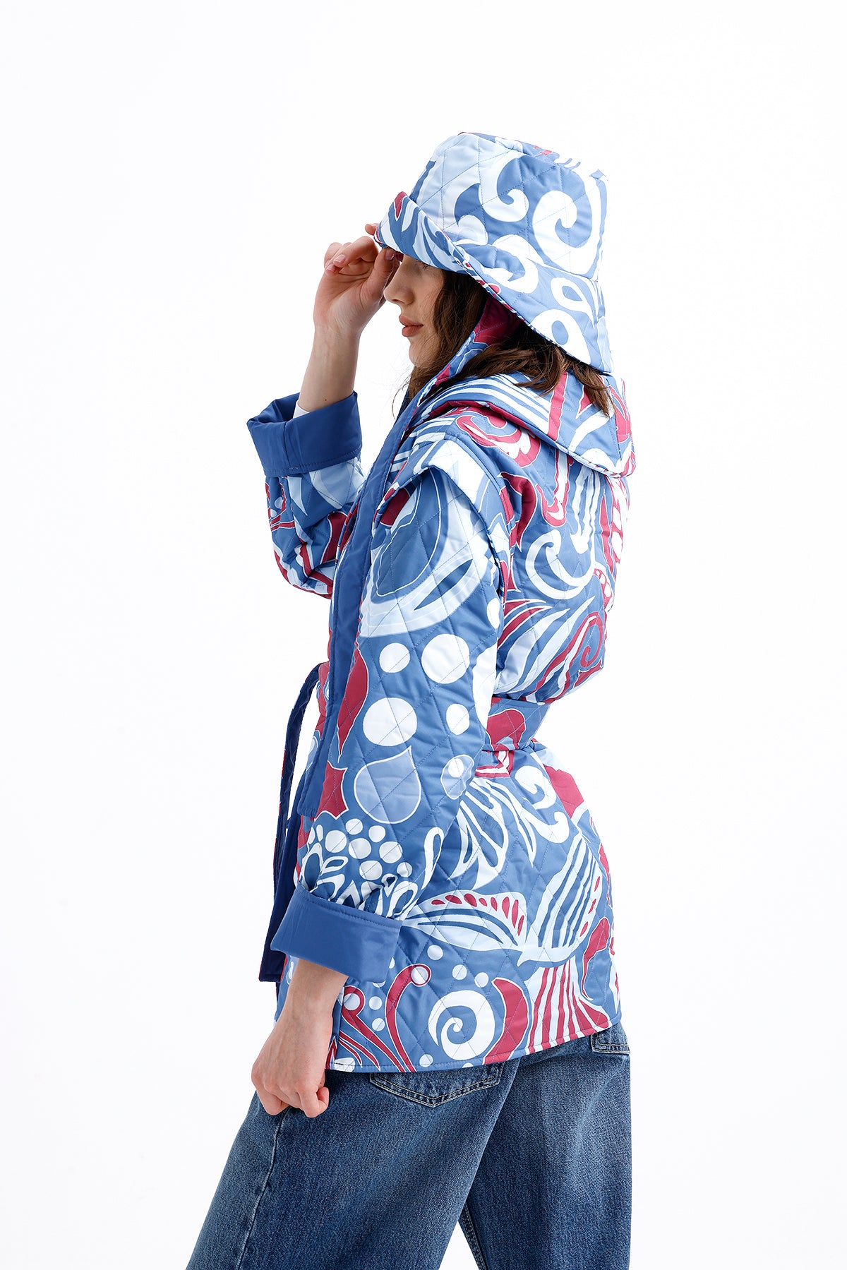 Hafif, suya dayanıklı kumaştan, koyu mavi, bordo ve beyaz soyut girdaplarla üretilen bu dönüştürülebilir dış giyim parçası, işlevselliği ve sanatı bir araya getiriyor.