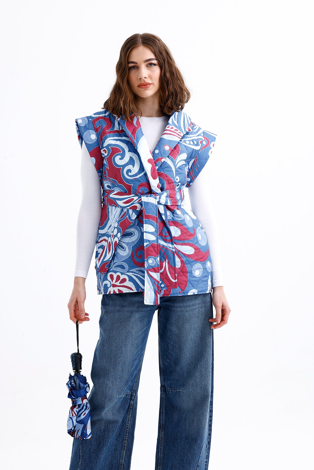 The Jersey Ceket Canlı mavi ve bordo tonlarında zahmetsizce katmanlama için tasarlanmış, iddialı bir kapitone paltodan kolsuz bir yeleğe dönüşüyor.