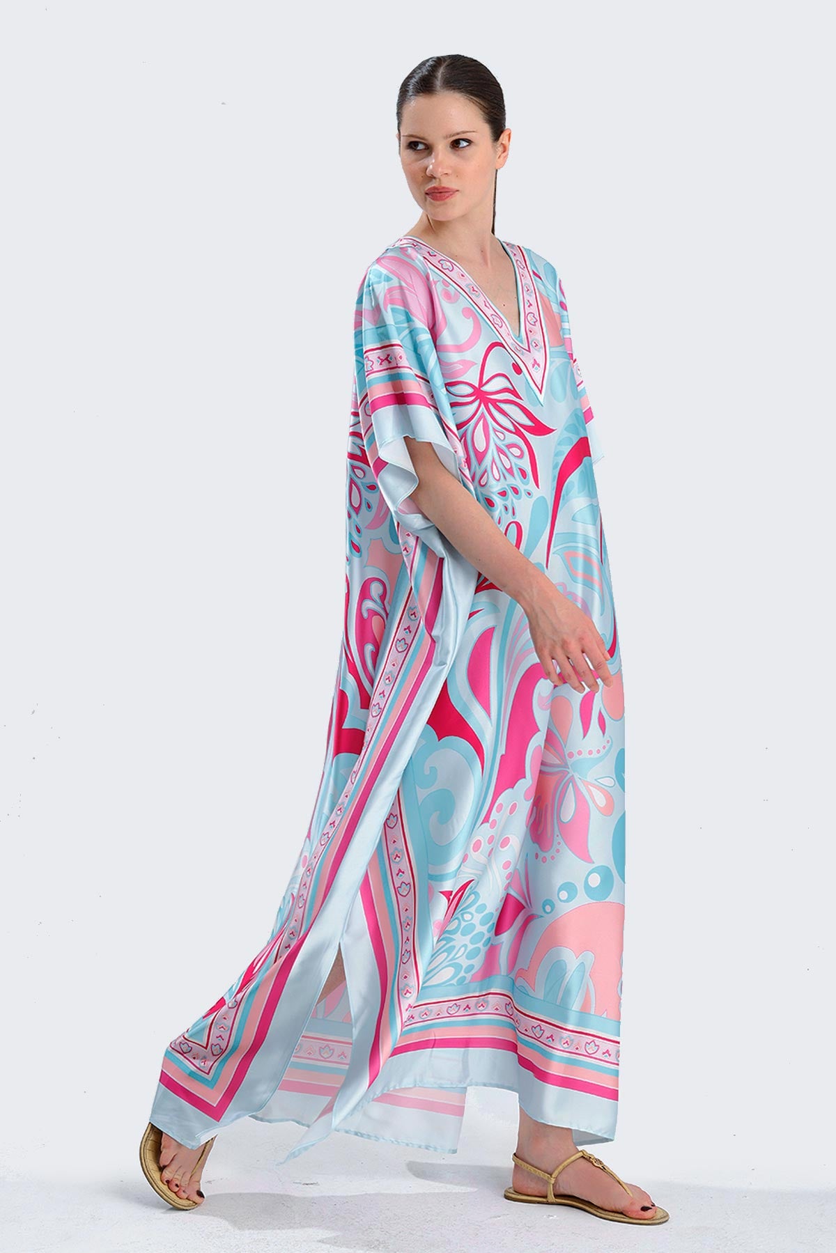 The Linda Kaftan Akıcı saten kumaşı ve pastel pembe-mavi baskısıyla kıyı lüksünü temsil ediyor; havuz başı şıklığı veya tatil akşamları için mükemmel.